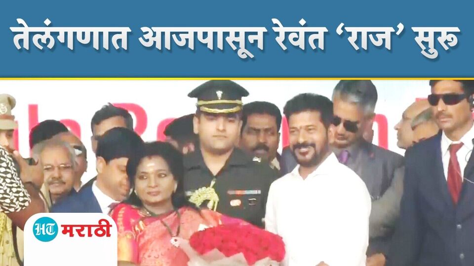 Revanth Reddy Oath Ceremony : काँग्रेस नेते रेवंत रेड्डी तेलंगणाचे नवे मुख्यमंत्री बनले आहे. हैदराबाद शहरातील LB स्टेडियममध्ये आयोजित भव्य कार्यक्रमात तेलंगणाच्या राज्यपाल टी. सौंदरराजन यांनी त्यांनी पद गोपनीयतेची शपथ दिली. रेवंत रेड्डी यांच्यासह १० मंत्र्यांनीही मंत्रीपदाची शपथ घेतली. भट्टी विक्रमार्क यांनी उपमुख्यमंत्री बनवले आहे.